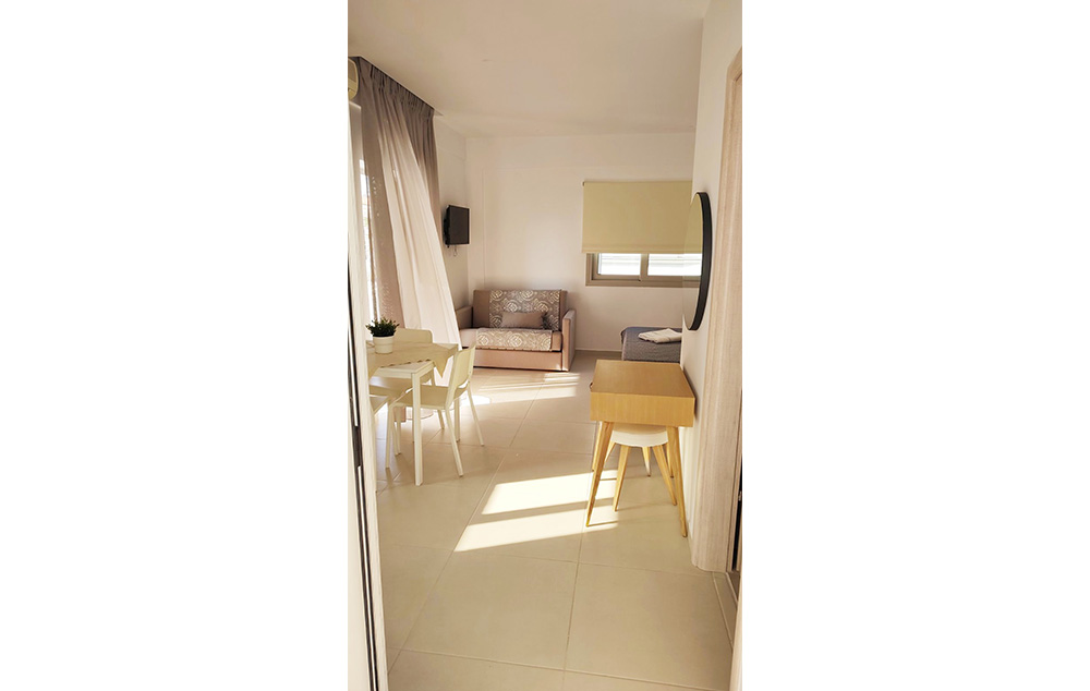 Manji dvokrevetni + 1 studiji (STD 1/2, STD 1/2+1) se nalaze u malo izdignutom prizemlju i na prvom spratu. Lepe i velike terase (sa garniturom za sedenje) gledaju ka vrtu. Studiji su manji, ali funkcionalni i u njima se pored standardnog ležaja, nalazi i prošireni ležaj (francuski ležaj po grčkim standardima-120 cm) na kojem može spavati jedan od roditelja sa detetom. Pored čajne kuhinje sa odgovarajućim posudjem i malim frižiderom (40 l sa komoricom za led) studio je opremljen TV-om, klima uredjajem (uz doplatu na licu mesta (opcija), 5 eur dnevno po studiju), wi – fi Iinternetom, ima malo kupatilo i lepu terasu sa garniturom za sedenje. Ležaljke i suncobrani oko bazena se ne naplaćuju. Studiji su ograničeni na maksimum dve odrasle osobe i dete dodvanaest godina (koje deli prošireni ležaj sa roditeljem). Veličina studija je cca 16 kvm + terasa.