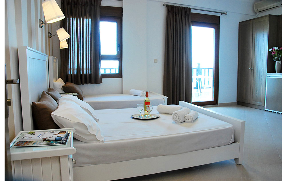 Opis:Trokrevetni i četvorokrevetni apartmani (1/3 APP, 1/4 APP) sastoje se od dve spavaće sobe (od kojih se kroz jednu ulazi u apartman, ima dva standardna ležaja ili francuski i bez vrata ka prolaznoj kuhinji, a druga ima izlaz na terasu i ima francuski ležaj ili dva standardna), male kuhinje, kupatila i velike terase sa garniturom za sedenje sa bočnim pogledom na more, okrenute prema maloj ulici i plaži.Svi apartmani su opremljeni klima uredjajem (uz doplatu na licu mesta (opcija), 8 eur dnevno po apartmanu), wi – fi Internetom i TV - om. Veličina apartmana je cca 35 kvm + terasa.Vila Rigakis Mol je B kategorije, nema peškire i nema mogućnost sopstvenog parkinga.