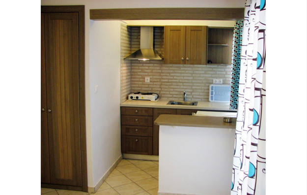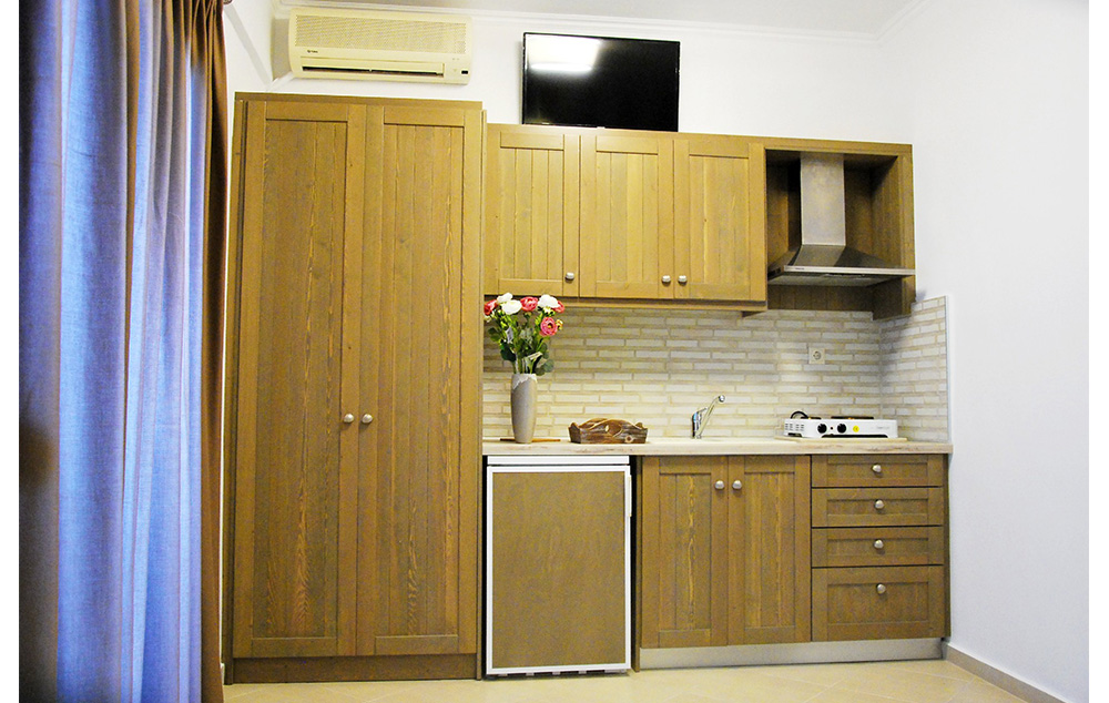 Manji dvokrevetni + 1 studiji (STD 1/2, STD 1/2+1) se nalaze u malo izdignutom prizemlju i na prvom spratu. Lepe i velike terase (sa garniturom za sedenje) gledaju ka vrtu. Studiji su manji, ali funkcionalni i u njima se pored standardnog ležaja, nalazi i prošireni ležaj (francuski ležaj po grčkim standardima-120 cm) na kojem može spavati jedan od roditelja sa detetom. Pored čajne kuhinje sa odgovarajućim posudjem i malim frižiderom (40 l sa komoricom za led) studio je opremljen TV-om, klima uredjajem (uz doplatu na licu mesta (opcija), 5 eur dnevno po studiju), wi – fi Iinternetom, ima malo kupatilo i lepu terasu sa garniturom za sedenje. Ležaljke i suncobrani oko bazena se ne naplaćuju. Studiji su ograničeni na maksimum dve odrasle osobe i dete dodvanaest godina (koje deli prošireni ležaj sa roditeljem). Veličina studija je cca 16 kvm + terasa.