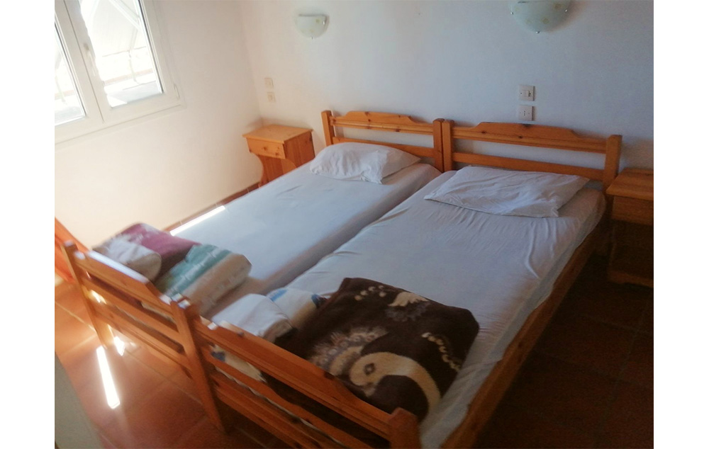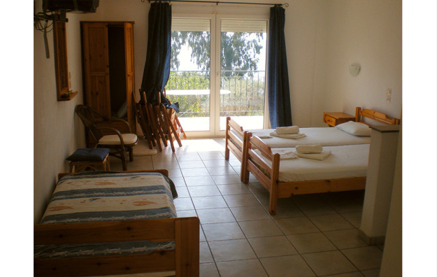 Vila Maria se nalazi u lepom mediteranskom vrtu, na idealnoj lokaciji, oko 800 metara od centra grada, na svega oko 170 metara od prelepe i jedne od najpoznatijih plaža na ostrvu, plaže Megali Amos (Velika plaža). Dvokrevetni i trokrevetni studiji vile Maria su smešteni na prvom spratu, a četvorokrevetni apartman na malo izdignutom prizemlju i svi su sa pogledom na dvorište. Opremljeni su klima uredjajem (uz doplatu na licu mesta (opcija), 8 eura dnevno po studiju/apartmanu), wi - fi Internetom i TV - om. Dvokrevetni i trokrevetni studiji sadrže opremljenu malu kuhinju sa delom za spavanje sa dva, odnosno tri standardna ležaja, kupatilo i lepu terasu sa garniturom za sedenje. Veličina studija je cca 18 – 20 kvm + terasa. Četvorokrevetni apartman se sastoji dnevnog boravka u kojem se nalazi dobro opremljena kuhinja (veliki frižider sa zamrzivačem, šporet sa rernom...) trpezarijski sto, ugaona sofa na kojoj može spavati dvoje dece do 12 godina, spavaće sobe sa francuskim ležajem, kupatila i velike terase sa garniturom za sedenje i pogledom na vrt. Veličina apartmana je cca 33 kvm + terase. Vila Maria je B kategorije, ima peškire i javni besplatni parking preko puta vile. Najbliži mini market je ispred vile, a autobuska stanica u neposrednoj blizini. Vila je idealna za mlade zbog blizine grada, ali i za porodice, jer je plaža u neposrednoj blizini, ima zidani roštilj i dvoršte koje je na raspolaganju deci.