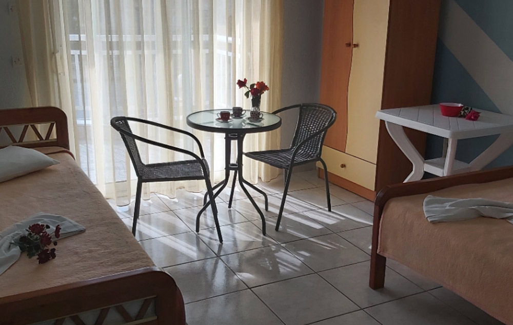 Opis: Vila Tasos u ponudi ima dvokrevetne, trokrevetne i četvorokrevetne studije na visokom prizemlju i drugom spratu. Sve smeštajne jedinice poseduju opremljen kuhinjski deo, kupatilo, terasu, TV, klima uređaj (uz doplatu na licu mesta od 7€ dnevno).
